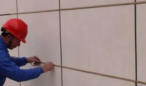 膩子施工完,涂刷抗堿封閉底漆后,可進(jìn)行分格縫工序。根據(jù)設(shè)計的分格大小,用彈線的方式在墻面上畫分格。